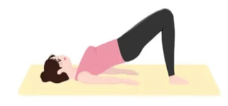 1、臀桥:仰卧位,双腿靠拢臀部收紧,大腿前侧收紧上提,小腿垂直于地面,膝盖与脚尖同向,抬起腰部,头、肩、臀在提条直线上,双手放于身体两侧。