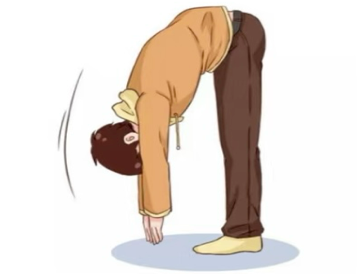 4、背部拉伸:站立位,腿伸直,膝盖尽量不要弯曲,身体向下弯曲,感受背部拉伸,放松全身。