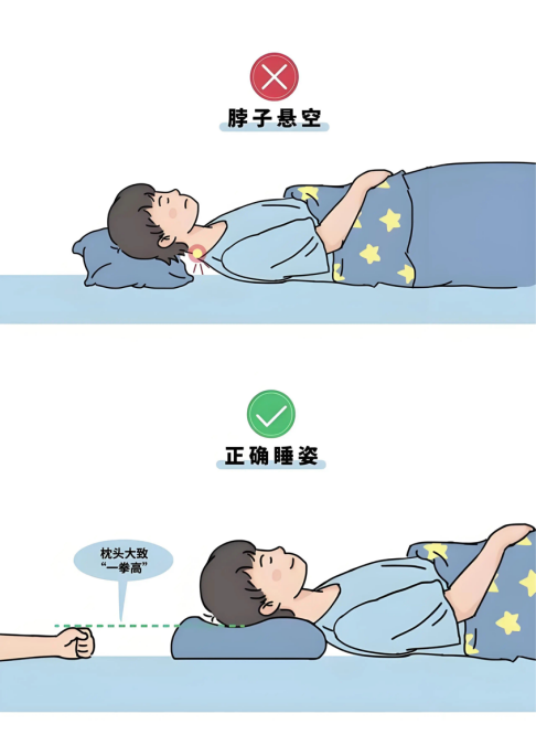 选择合适的枕头高度,一般建议枕头高度以一拳(8-10cm)为宜,能够支撑颈部生理曲度,避免过高或过低导致颈椎不适;保持床铺软硬适中,有助于颈椎放松。