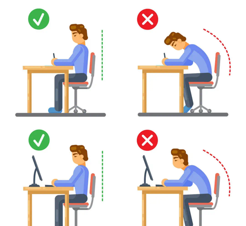 电脑办公:屏幕与眼睛平视,键盘和鼠标放在合适高度,避免耸肩。