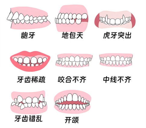 牙齿发育方面:乳牙提前脱落或迟迟不脱落;恒牙萌出顺序混乱,比如该长的恒牙没长,不该长的位置却萌出牙齿;牙齿明显拥挤,乳牙期就没有正常牙缝,甚至牙齿相互叠压;或者牙齿间隙过大,伴随咬合异常;出现 “地包天”(下牙咬在上牙外侧)、上牙覆盖下牙超过 1/3(深覆合),以及上下牙无法咬合(开颌)的情况。