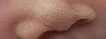 多见于面部、颈部及腋下,表现为针尖至粟粒大小的白色或黄色小丘疹,由皮脂腺未完全发育或汗腺堵塞引起。