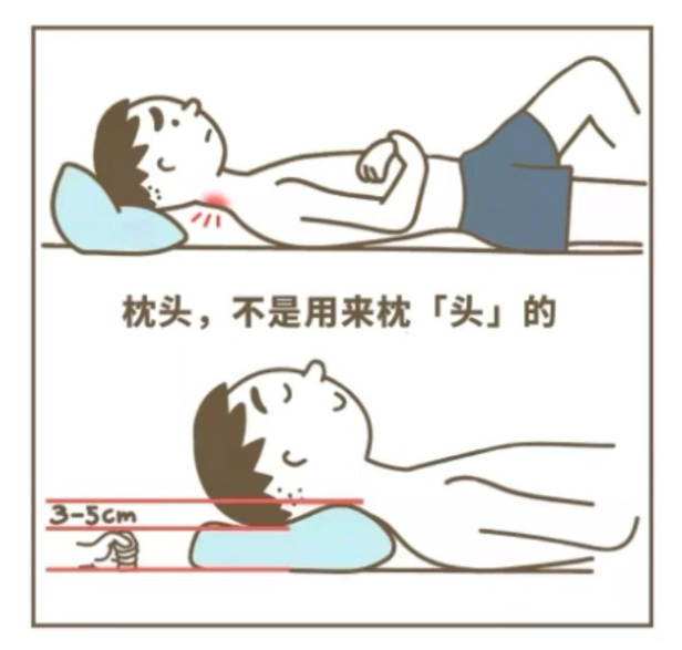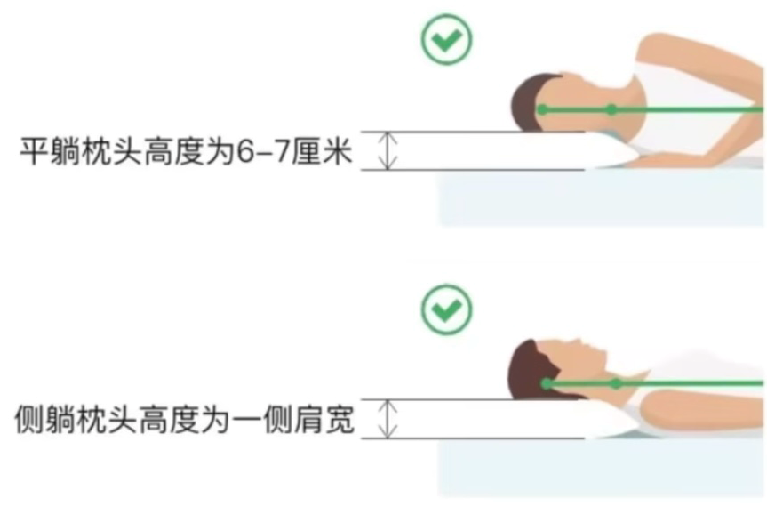 很多朋友喜欢把头垫高点选择硬枕头,高枕头,享受“高枕无忧”的睡觉;还有的朋友认为不垫枕头休息时放松效果更好。但睡眠时枕头不合适,过高、过低或过软、过硬,都容易使头颈处于过伸或过屈状态,对颈椎关节和肌肉产生损伤,造成肌肉持续疲劳,引起落枕。枕头不是为了“枕头”,主要是“托颈”,对颈部提供支撑。最佳的枕头应该是能支撑颈椎的生理曲线。能够塑形并有较好的支撑,枕芯应当选择荞麦皮的枕芯。喜欢平躺,那枕头的高度为6-7厘米左右,也就是一拳高;喜欢侧身睡的,高度为一侧肩宽左右。