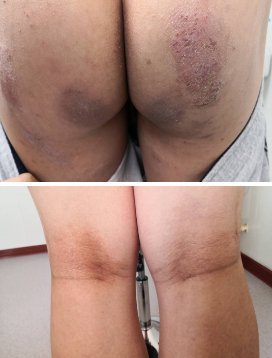 ①湿疹型。皮损多呈急性或慢性湿疹的外观, 皮肤干燥且易于苔藓化,常伴剧烈瘙痒。好发于肘窝、腘窝和小腿的伸侧。