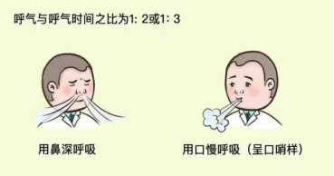 吸气时用鼻子,呼气时嘴唇呈缩唇状慢慢呼气。