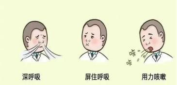 患者在坐位或半卧位,身体稍前倾,缓慢深呼吸数次,吸气后屏气数秒,用手按压胸骨下方,连续咳嗽2~3次,休息后可重复上述动作。