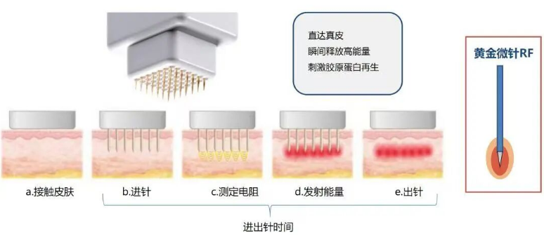 它的针头镀了一层黄金膜,进入皮肤后会在特定深度释放射频能量。针尖细度在0.15mm—0.2mm范围,进入和退出皮肤的过程约0.2—0.5秒。之所以叫“黄金”,是因为金具有稳定的导电性和生物相容性,能帮助能量更精准地到达目标层次,同时减少表皮热损伤。