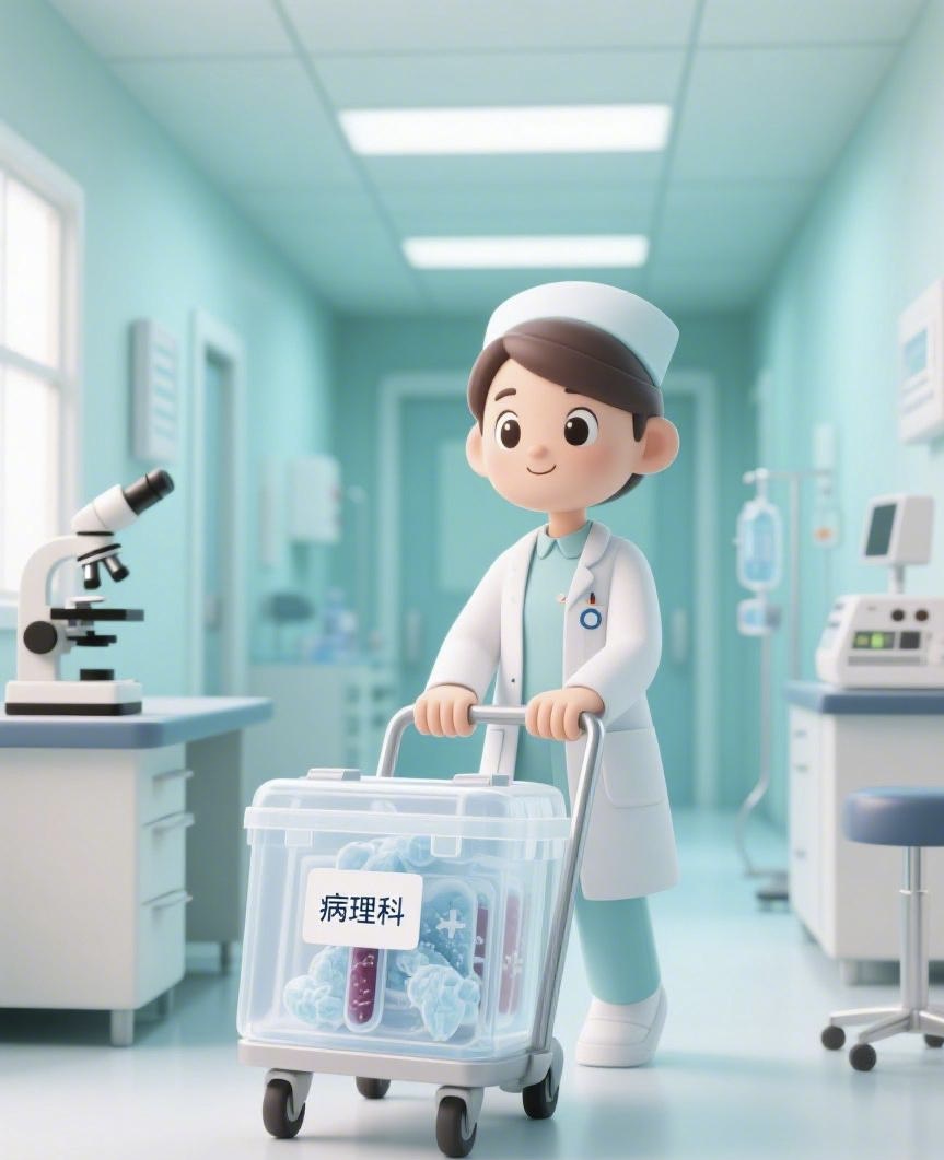 医生取出标本后,由护士立即装入标本袋中,连同《病理组织检验送检单》一起迅速送到病理科。