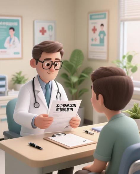 临床医生与病人签署《术中快速冰冻知情同意书》,告知其意义和局限性。临床医生向病理科提交《术中冰冻申请单》,填写病人的病史、重要的检查结果等信息。