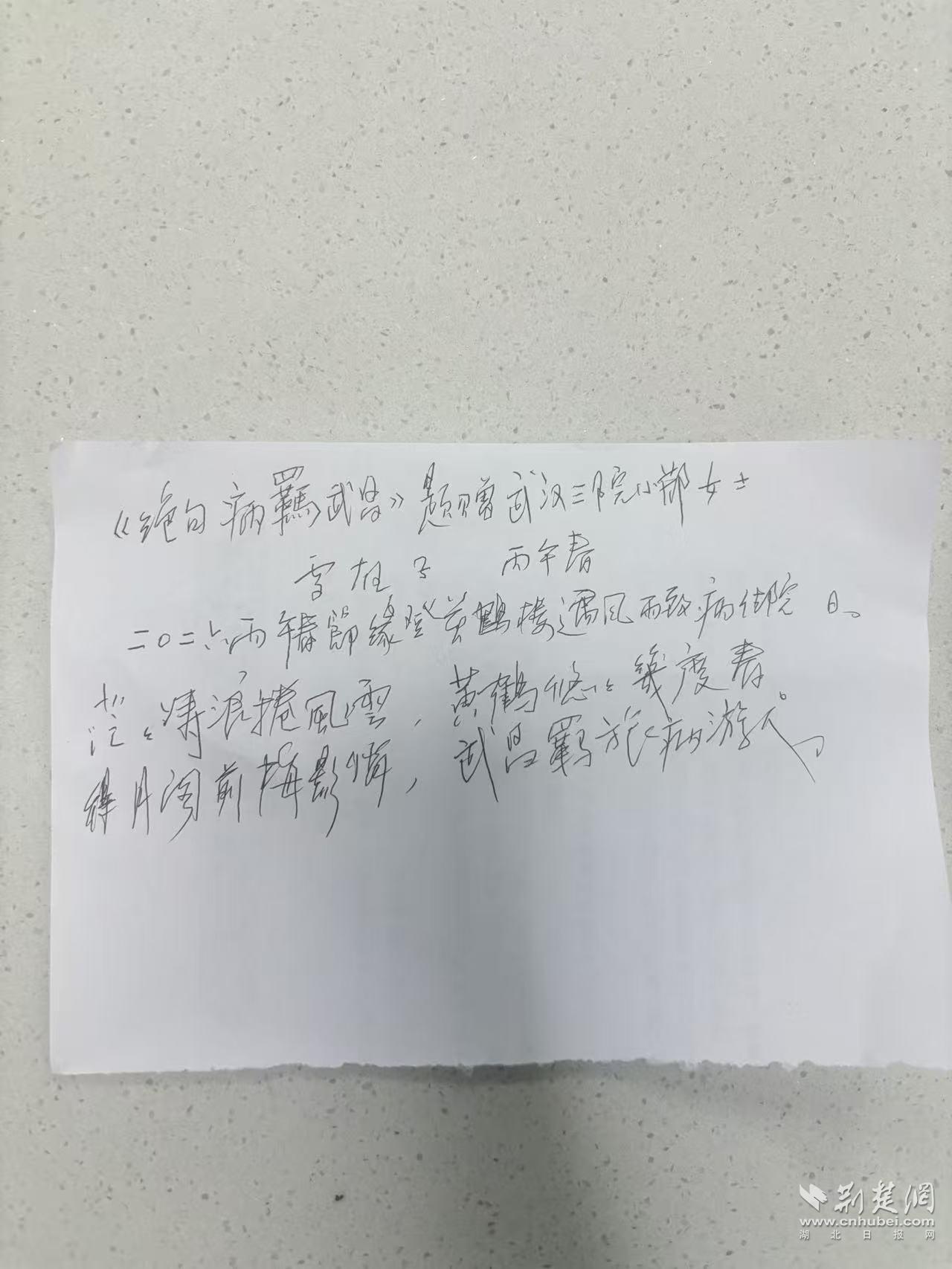 “茫茫涛浪卷风云,黄鹤悠悠几度春。得月阁前梅影俏,武昌羁旅病游人。”2月25日,武汉市第三医院收到一份特殊的新春礼物:来自西安的83岁退休语文教师雷爷爷,将一首原创诗作《绝句・病羁武昌》赠予医护人员,以笔墨抒怀,记录自己在汉历经生死、重获安康的暖心经历。