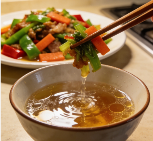 我们在外出聚餐时,遇到像干锅、油焖、红烧等油腻菜肴,我们可以准备一杯清茶或者温水。吃之前轻轻的涮一下,这样做可以大约减少近一半的附着油脂,帮助控制热量。