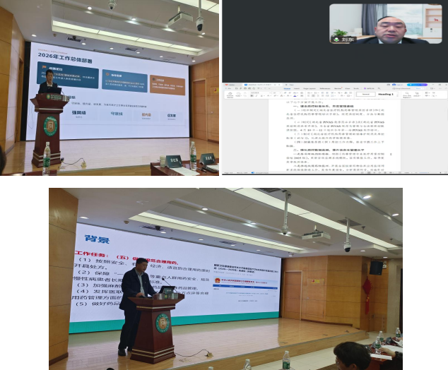 随后武汉市质控中心管理办公室孟庆彬主任详细解读《武汉市质控中心管理注意要点》,规范质控中心运行流程,明确工作标准与要求,并对武汉市临床药学质控中心工作给予了高度肯定。湖北省临床药学质控中心刘东主任作2026年全省药学质控工作重点部署,明确2026质控中心工作任务和工作方向。武汉市临床药学质控中心办公室曾庆源主任对我质控中心耗时近2年编撰出版的《基层医疗机构药事质量控制与管理》进行专业编撰解读,为基层医疗机构药事管理提供了标准化、规范化的实操依据。最后武汉市临床药学质控中心主任吴金虎作大会总结,梳理会议成果,部署2026年全市临床药学质控重点工作,号召全体药学工作者坚守初心、真抓实干。